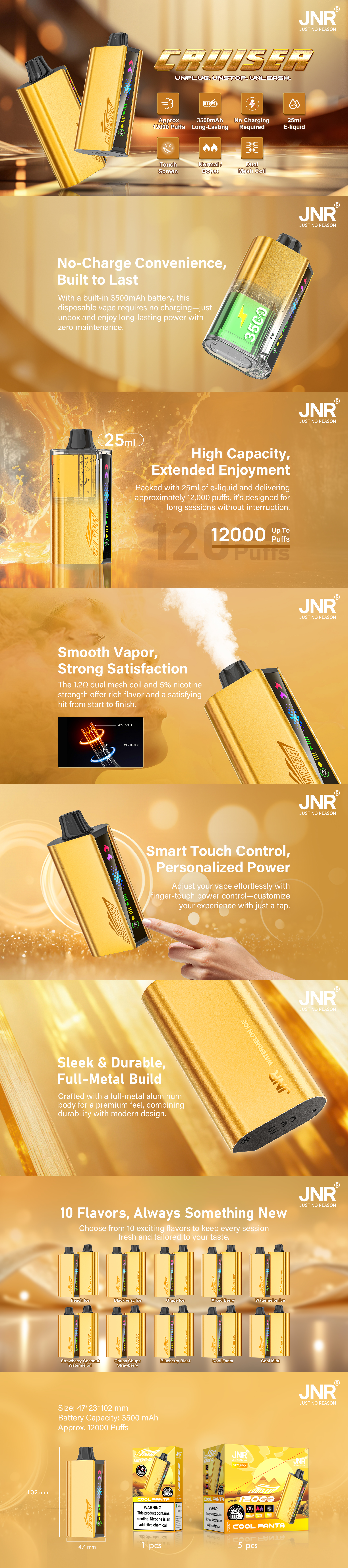 Featuring a sleek full-metal aluminum bofy,an intuitive smart touch screen control,and a powerful 12,000-puff capacity with 25ml of e-liquid,JNR redefines what modern vaping should feel like.With dual puff modes and a wide range of flavors,we offer the perfect combination of personalization and performance.This is more than just a vape- it's the mark of a global brand built on innovation,quality,and style.